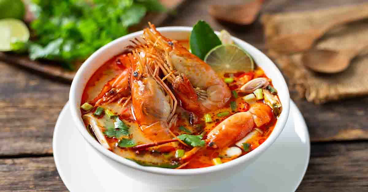 Tom Yum este un fel de mâncare tradițional din Thailanda, o supă picantă de creveți sau alte fructe de mare, preparată cu un amestec de condimente și ierburi, precum lemongrass, coriandru, ghimbir și ardei iute. Supa este adesea garnisită cu frunze de coriandru, ceapă verde și alte ierburi, pentru a adăuga o textură și un gust suplimentar.