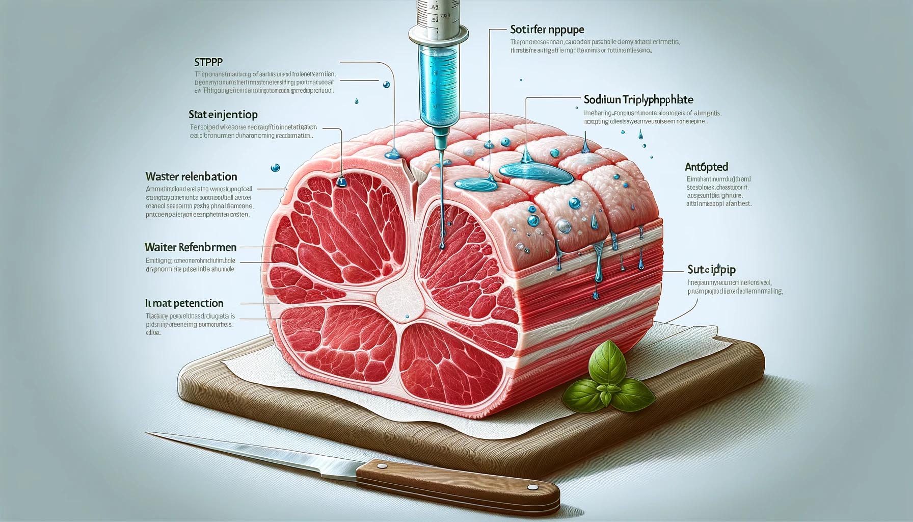 STPP acționează ca un agent de chelare, legându-se de ioni de calciu și magneziu prezenți în carne, ceea ce conduce la schimbări în structura proteinelor. Principalele sale efecte sunt: