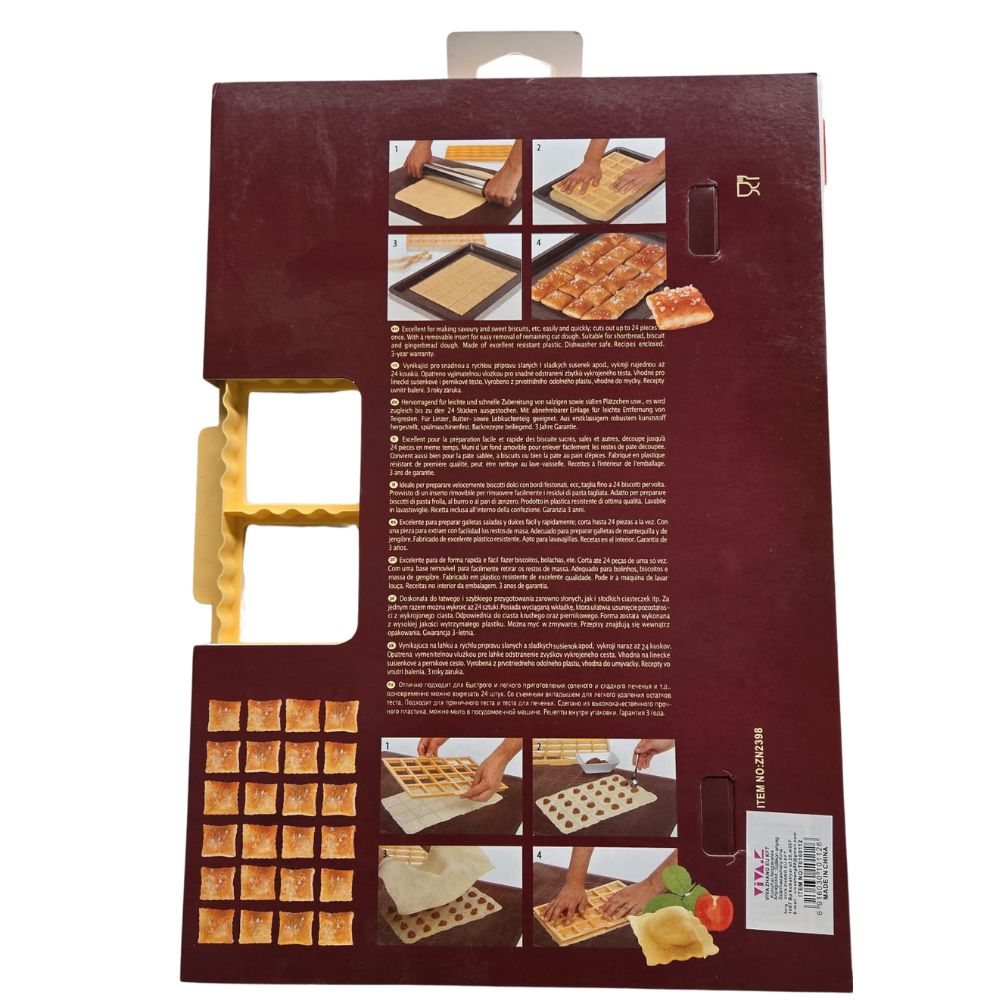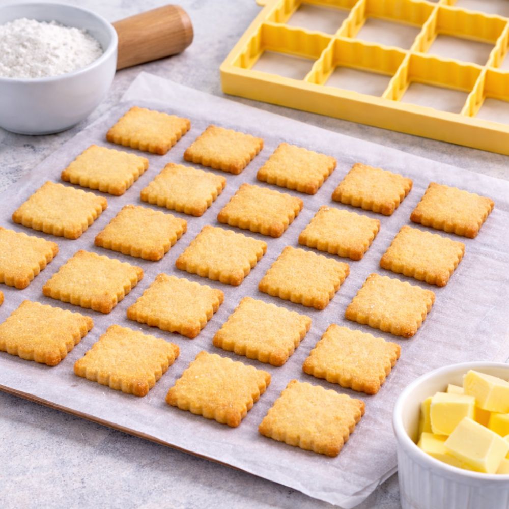 Formă practică pentru decuparea rapidă a 24 de biscuiți pătrați dintr-o singură apăsare. Ideală pentru fursecuri dulci sau sărățele, economisește timp și asigură bucăți uniforme.