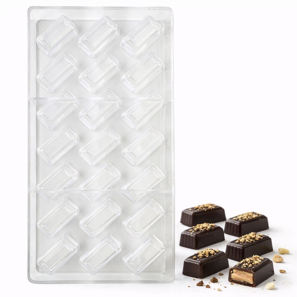 Modelul conține 21 de cavități dreptunghiulare, dispuse uniform, perfecte pentru obținerea unor praline elegante, cu aspect profesional. Designul dreptunghiular este ideal pentru combinații stratificate, ganache-uri fine, caramel, praline cu nuci sau inserții crocante.
