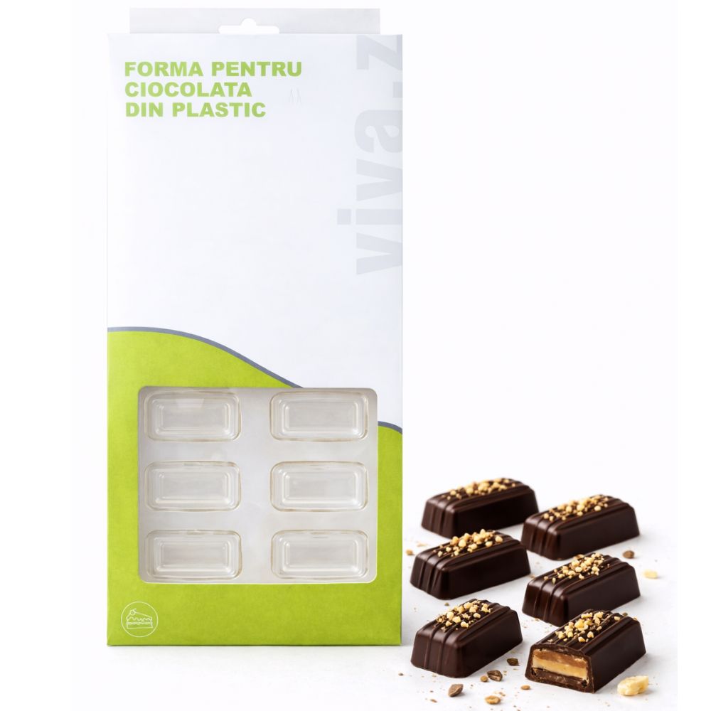 Formă pentru praline dreptunghiulare, realizată din plastic alimentar transparent, ideală pentru prepararea pralinelor fine, mini batoanelor de ciocolată sau bombonelor cu umplutură.