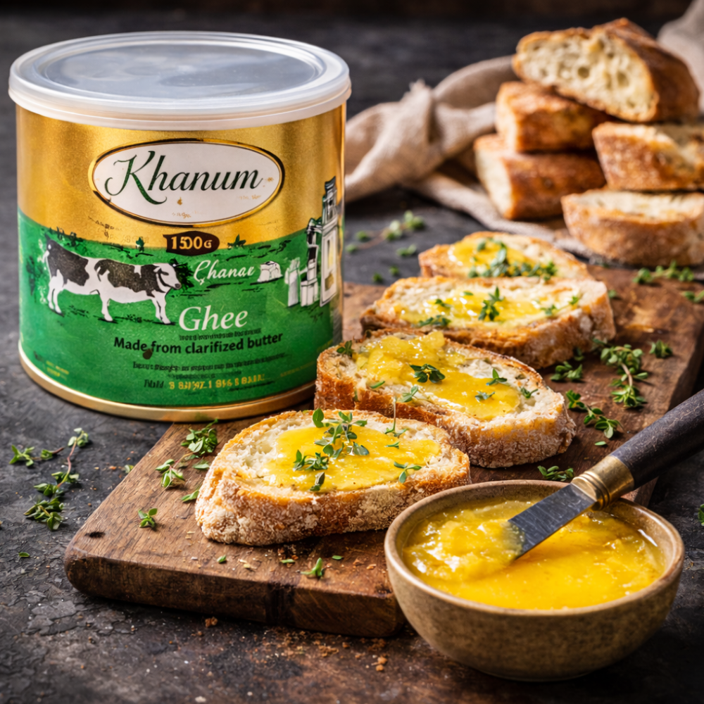 Ghee Khanum, apreciat pentru stabilitatea sa la temperaturi înalte și gustul delicat, este o alternativă excelentă la uleiurile vegetale sau untul clasic, fiind folosit pe scară largă în bucătăria indiană, orientală și internațională.