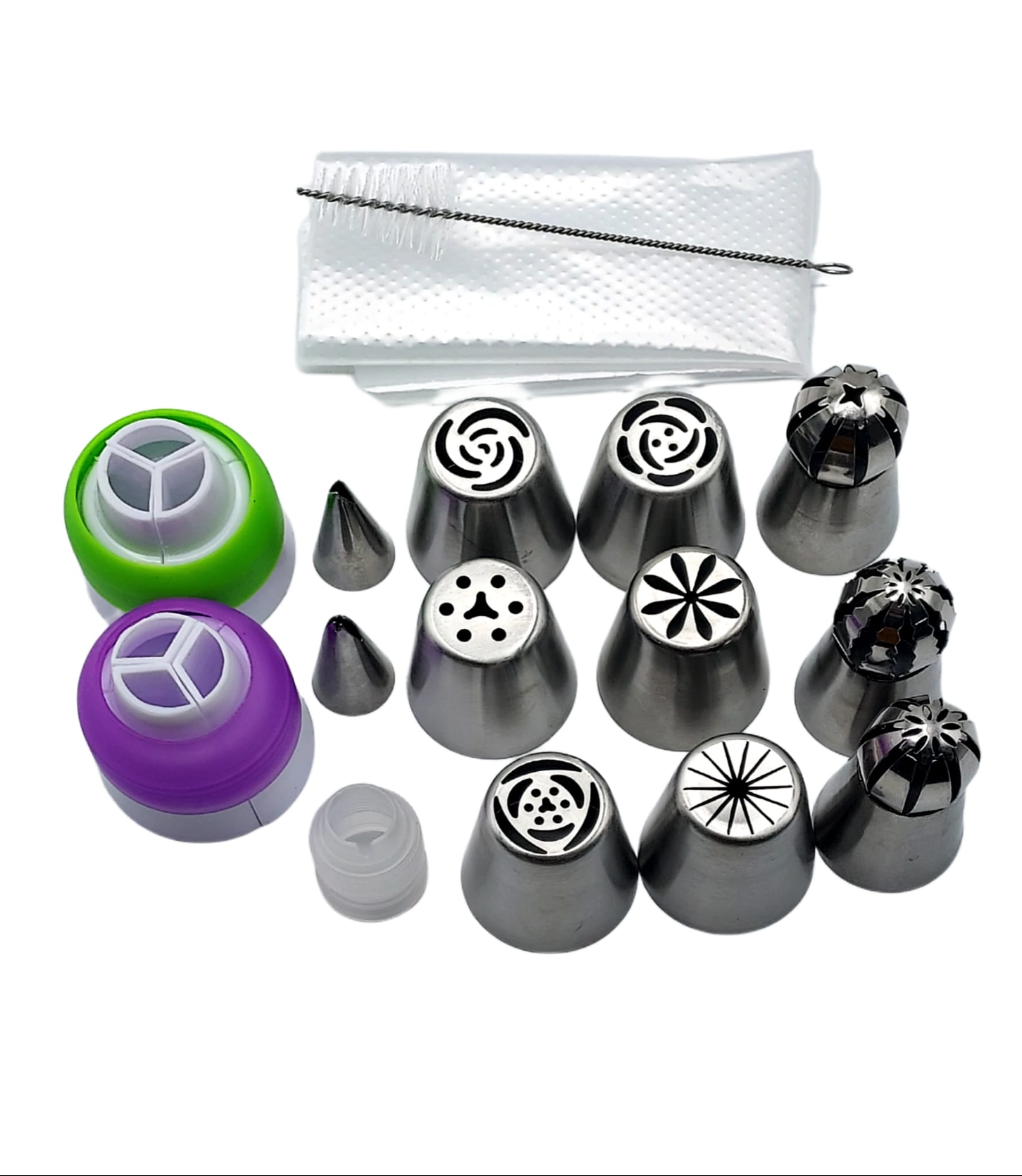 - Setul de 16 piese de ornare este conceput atat pentru cofetarii incepatori , cat si pentru cei profesionisti pentru a crea decoruri spectaculoase torturilor si deserturilor, din crema sau glazuri