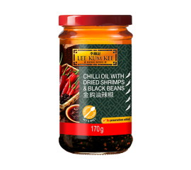 Lee Kum Kee Chilli Oil cu creveți uscați și fasole neagră este un condiment gustos și aromat, cu o combinație unică de ingrediente care îmbogățește experiența culinară.