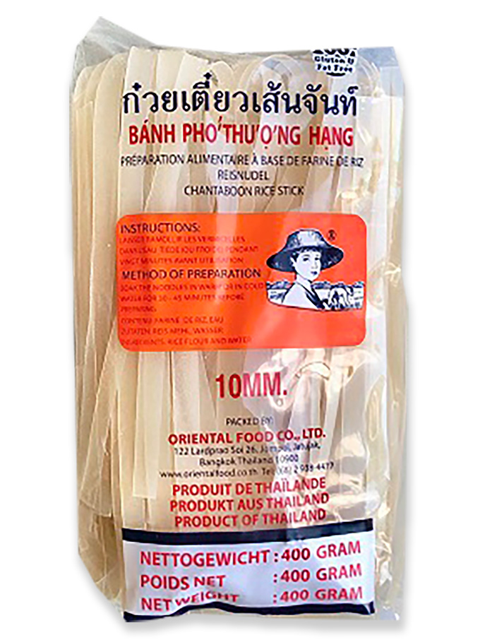 Chantaboon Rice Stick 10mm – cunoscuți și sub denumirea de Bánh Phở Thượng Hạng – reprezintă forma clasică, lată, a acestor tăiței, originari din provincia Chantaburi, una dintre cele mai vechi regiuni producătoare de orez din Thailanda.