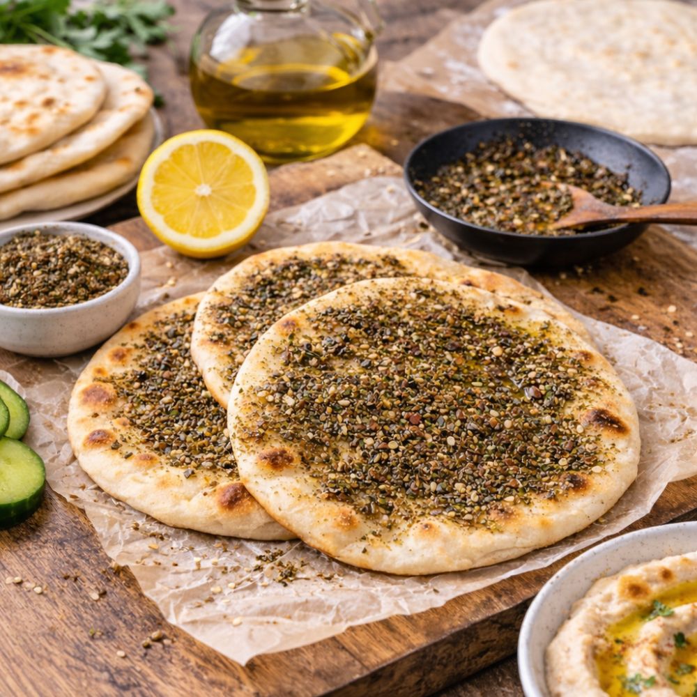 Lipiile se coc într-o tigaie bine încinsă, fără ulei, câte 1–2 minute pe fiecare parte. După coacere, se ung imediat cu amestecul de za’atar și ulei de măsline sau, alternativ, se pot unge înainte și coace direct cu toppingul deasupra.