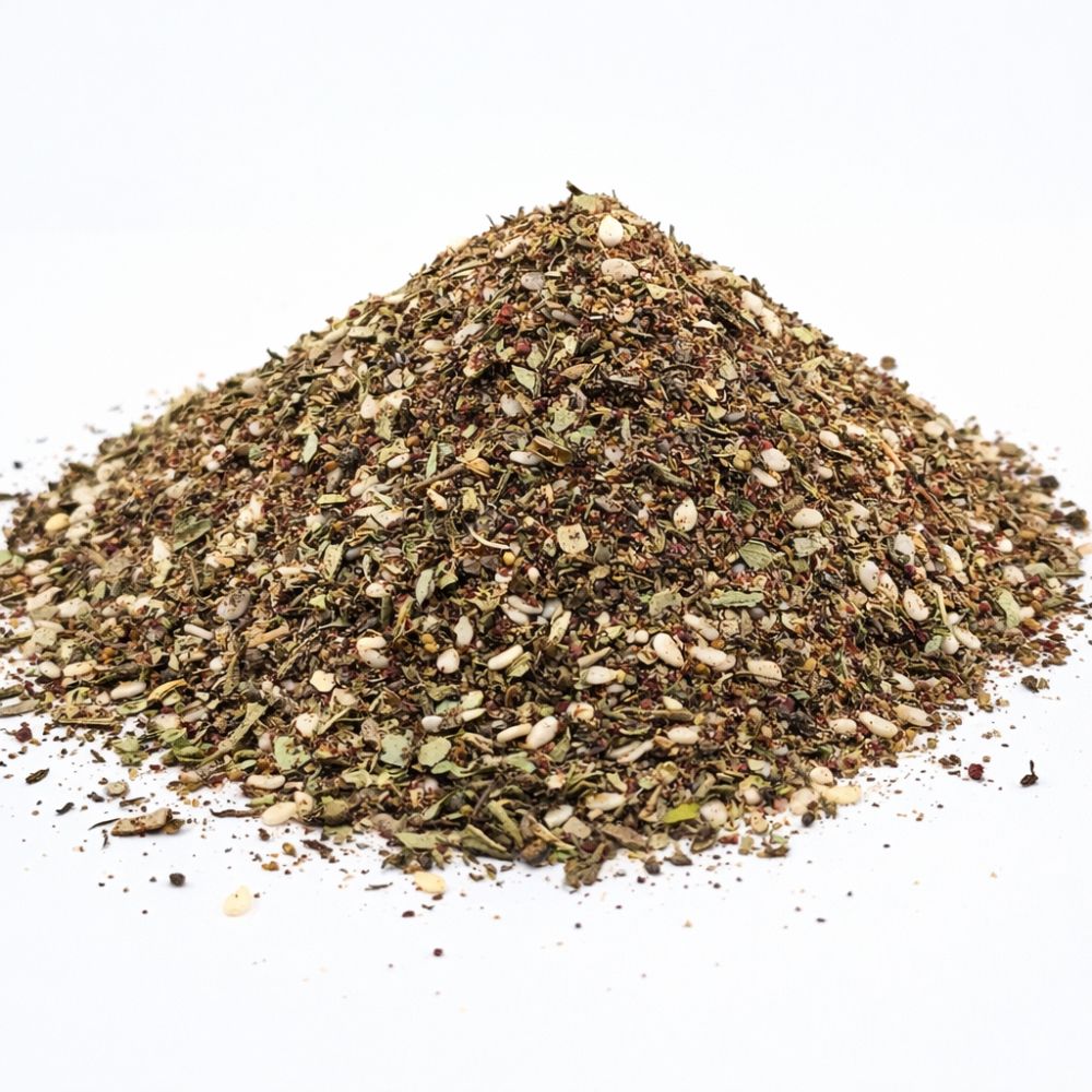 Zaatar este un amestec tradițional de condimente din bucătăria Orientului Mijlociu, apreciat pentru aroma sa complexă, ușor acrișoară și vegetală. Combinația de ierburi uscate, condimente și semințe oferă un gust echilibrat, intens și foarte versatil, potrivit atât pentru preparate simple, cât și pentru rețete autentice orientale.